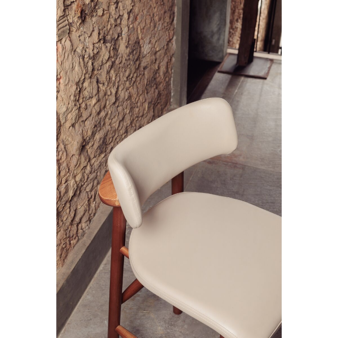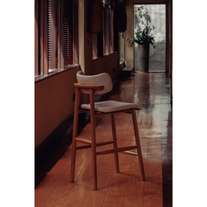 Banco alto de diseño orgánico en madera Tauarí con acabado almendra y tapizado beige tipo muy piel. Elegante, cómodo e inspirado en la cultura brasileña.