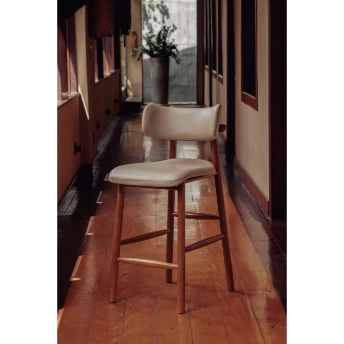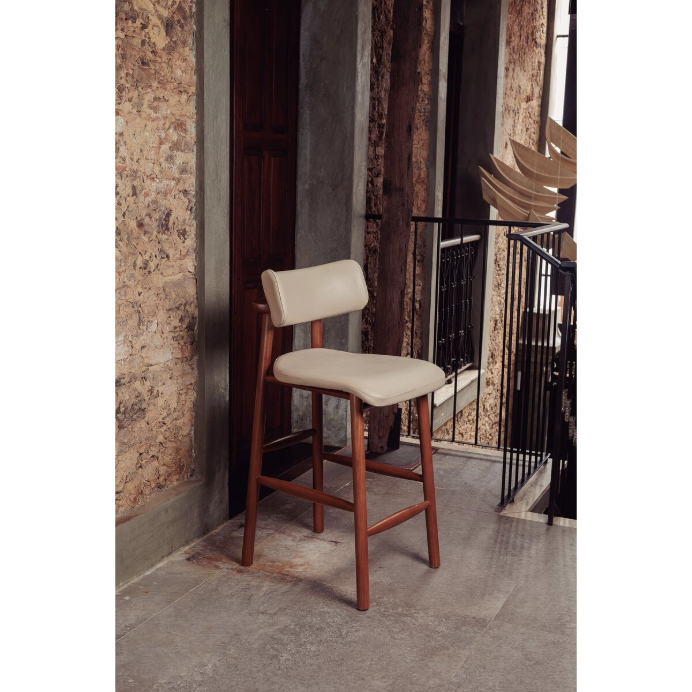 Construido en madera Tauarí con acabado en barniz PU tono almendra, ofrece durabilidad y una estética cálida. Su asiento está tapizado en beige tipo “muy piel”, aportando confort visual y táctil, ideal para barras, cocinas abiertas, restaurantes u hoteles que buscan una pieza con carácter y sofisticación.