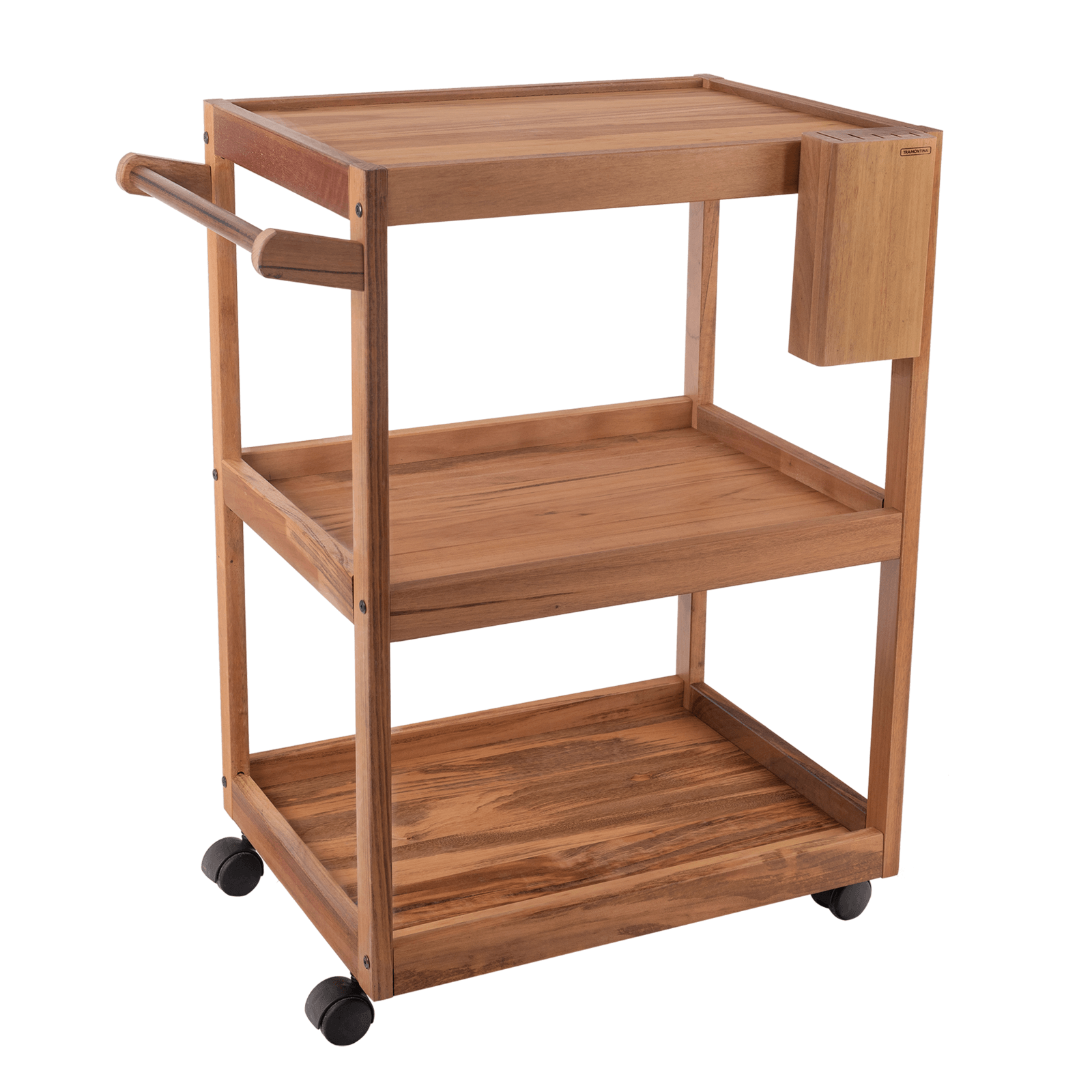 Carro de soporte fabricado en madera FSC Muiracatiara con acabado en aceite mineral. Elegante, práctico y funcional para cocina, terrazas o áreas sociales.