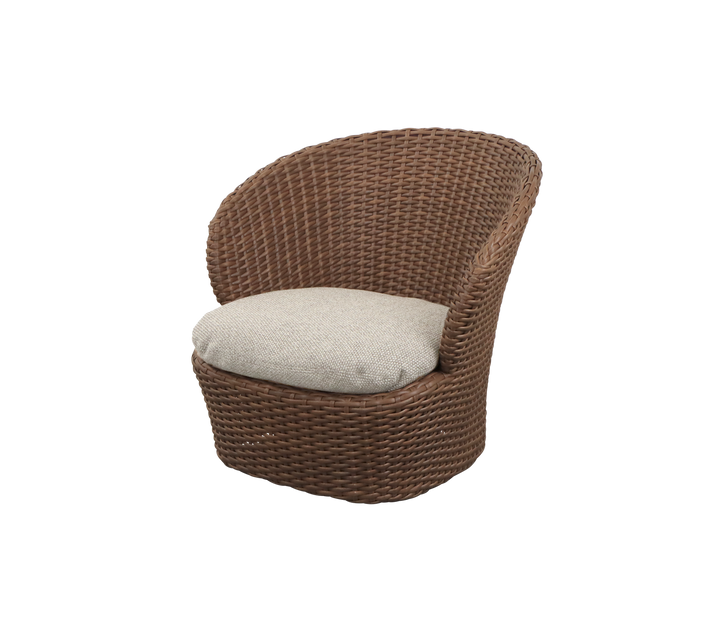 Sillón lounge giratorio con diseño envolvente en Cane-line Flat Weave®, cojines QuickDry y alto confort. Ideal para exteriores modernos.