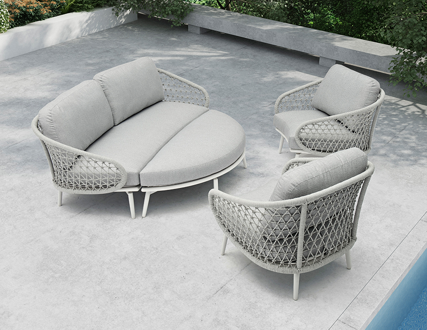 Este diseño combina resistencia estructural, comodidad y sofisticación estética, convirtiéndose en una opción ideal para espacios exteriores residenciales o contract. Su marco de aluminio soldado de calidad contractual garantiza una base sólida, ligera y anticorrosiva, preparada para el uso continuo en exteriores.