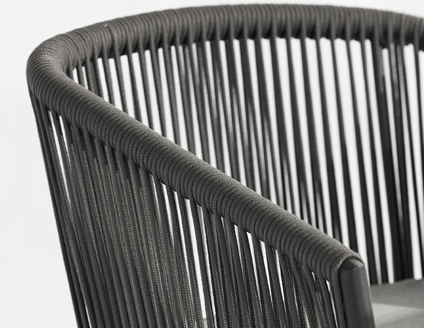 El trenzado está elaborado con cuerda de olefina para exteriores tratada contra rayos UV, reconocida por su resistencia al clima, suavidad al tacto y excelente conservación del color. Las mesas incorporan cubiertas de alto rendimiento, disponibles en cristal templado revestido de cerámica o en placa Europa HPL, ambas opciones resistentes al calor, la humedad y el uso intensivo.