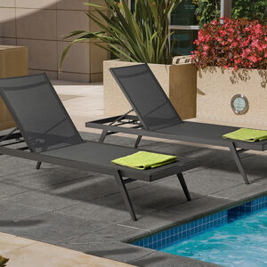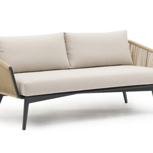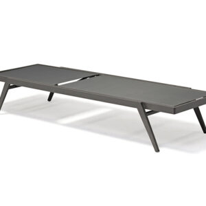 Colección con marco de aluminio soldado y recubrimiento Tiger®, cuerda de olefina UV y tapicería Sunbrella® o Axvision. Mesas con cubierta en cristal templado cerámico o placa Europa HPL. Diseño K/D para fácil instalación.