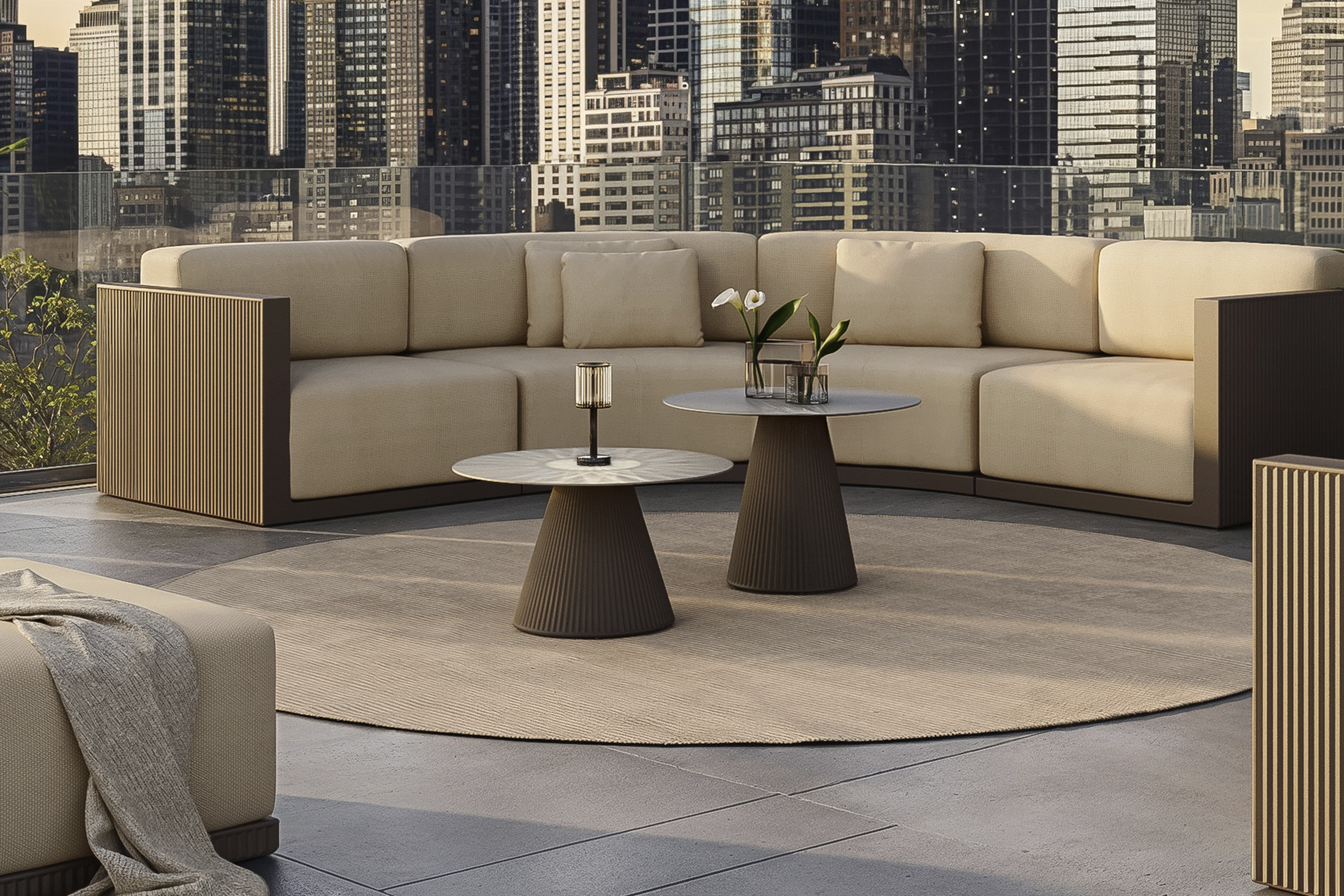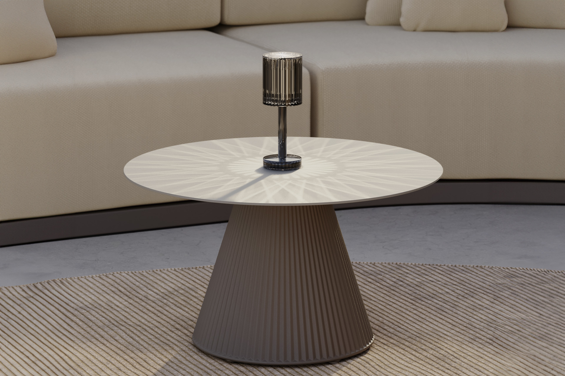 Color: Taupe 1048 / 66103B Yule Brown. La base Gatsby, en elegante tono Taupe 1048 y tablero HPL 66103B Yule Brown, es un complemento funcional y decorativo diseñado para aportar estilo a cualquier espacio. Su diseño cilíndrico y robusto está fabricado en polietileno de alta densidad, lo que garantiza resistencia al uso intensivo y a las condiciones climáticas adversas. Ideal para uso en hostelería o terrazas modernas, esta base puede combinarse con distintos tableros, creando mesas auxiliares, de comedor o de apoyo. El acabado efecto mármol o madera del sobre aporta sofisticación, mientras que la estructura mantiene la línea moderna y esculpida de la colección Gatsby. Su estética elegante y su funcionalidad la convierten en una pieza ideal para entornos de diseño contemporáneo.