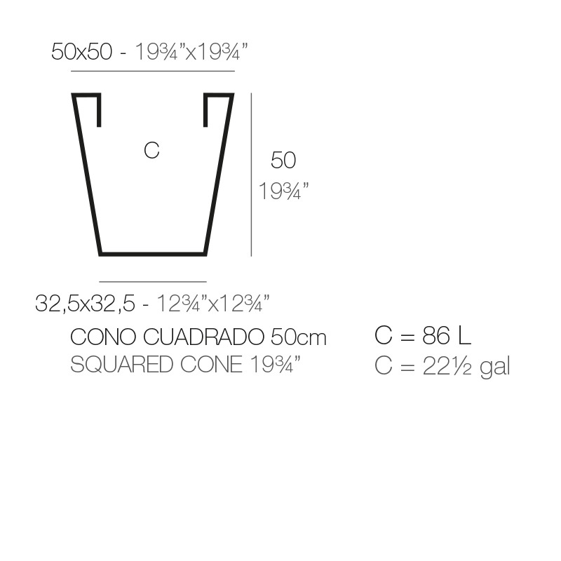 El Cono Cuadrado de 50 cm Studio Planters, fabricada en resina de polietileno mediante moldeo rotacional, es 100 % reciclable, apta para interior y exterior, y está disponible en diferentes acabados.