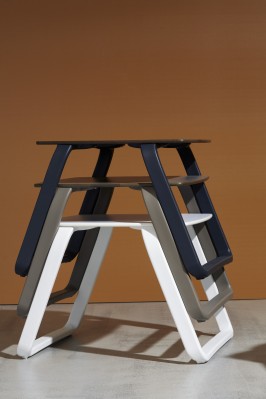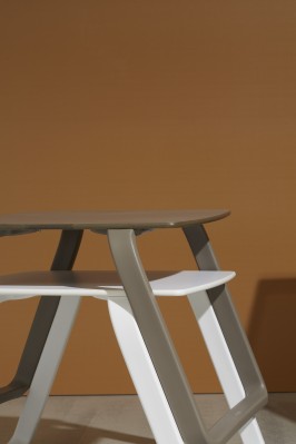 La estructura está compuesta por patas de polipropileno reforzado con fibra de vidrio, lo que garantiza una alta resistencia a la intemperie y al uso intensivo, sin perder ligereza. El tablero compacto ofrece una superficie estable, duradera y muy fácil de mantener.
