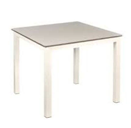 Mesa Portofino cuadrada con estructura de aluminio lacado y tablero compacto. Ideal para exteriores, fácil de limpiar y disponible en varios colores.