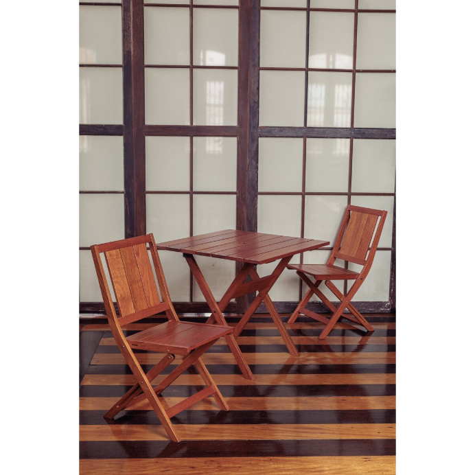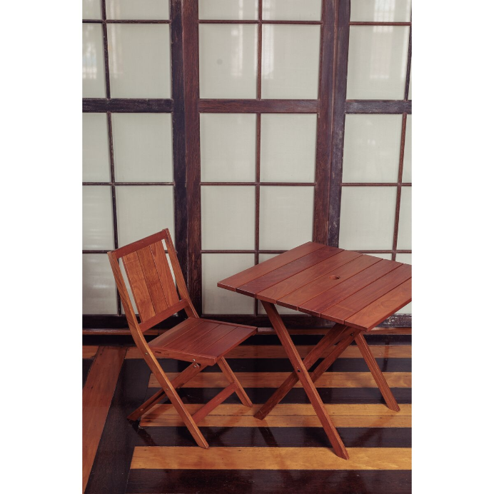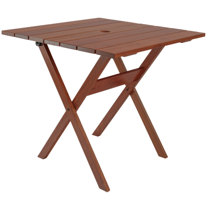 Mesa cuadrada de 80 cm en madera Jatobá FSC, con diseño plegable y espacio para sombrilla. Elegante, resistente y funcional para interiores o exteriores cubiertos.