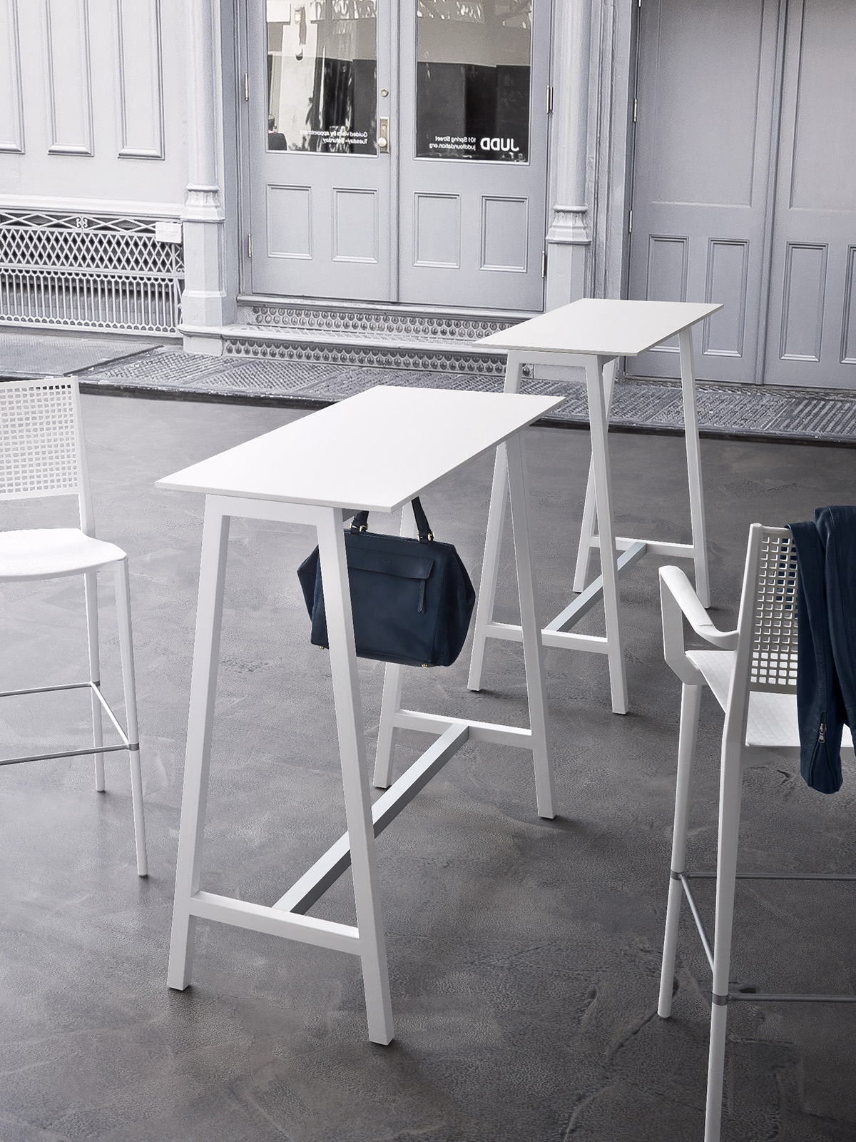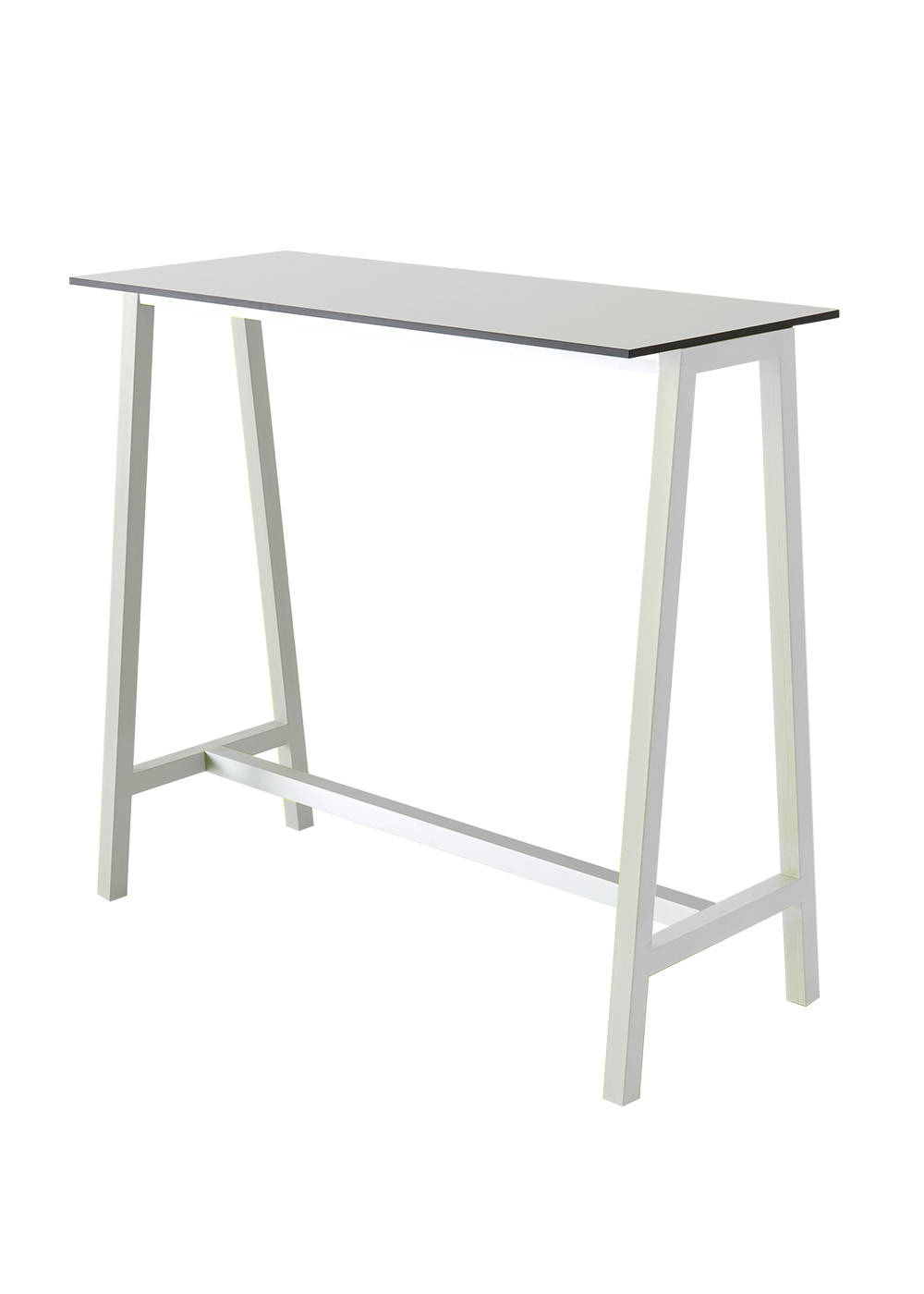 Mesa alta de 1.10?m de altura con estructura metálica sobremoldeada en tecnopolímero y cubierta compacta de 1.20 x 0.70?m. Ideal para uso interior y exterior.
