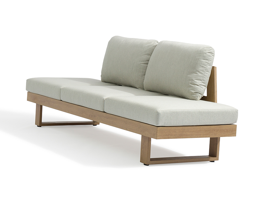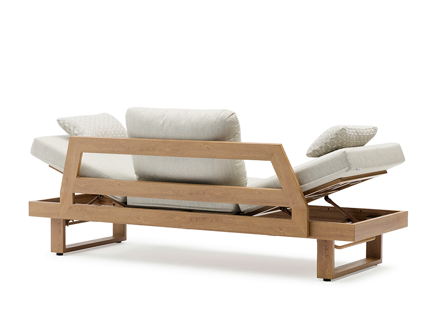 WINGS es un asiento multiposición que se transforma en sofá, tumbona o sofá cama. Con acabado ALUOAK®, ofrece la calidez de la madera sin mantenimiento y máxima versatilidad.