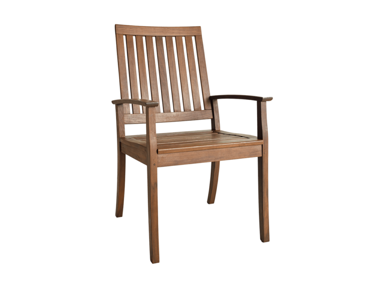 Diseñada para acompañar comidas prolongadas y reuniones sociales, destaca por su respaldo ligeramente inclinado, asiento robusto y brazos sutilmente arqueados, que brindan una experiencia ergonómica cómoda y relajada. Su estructura está elaborada con listones individuales de madera maciza de Ipe, aportando solidez y una estética refinada.