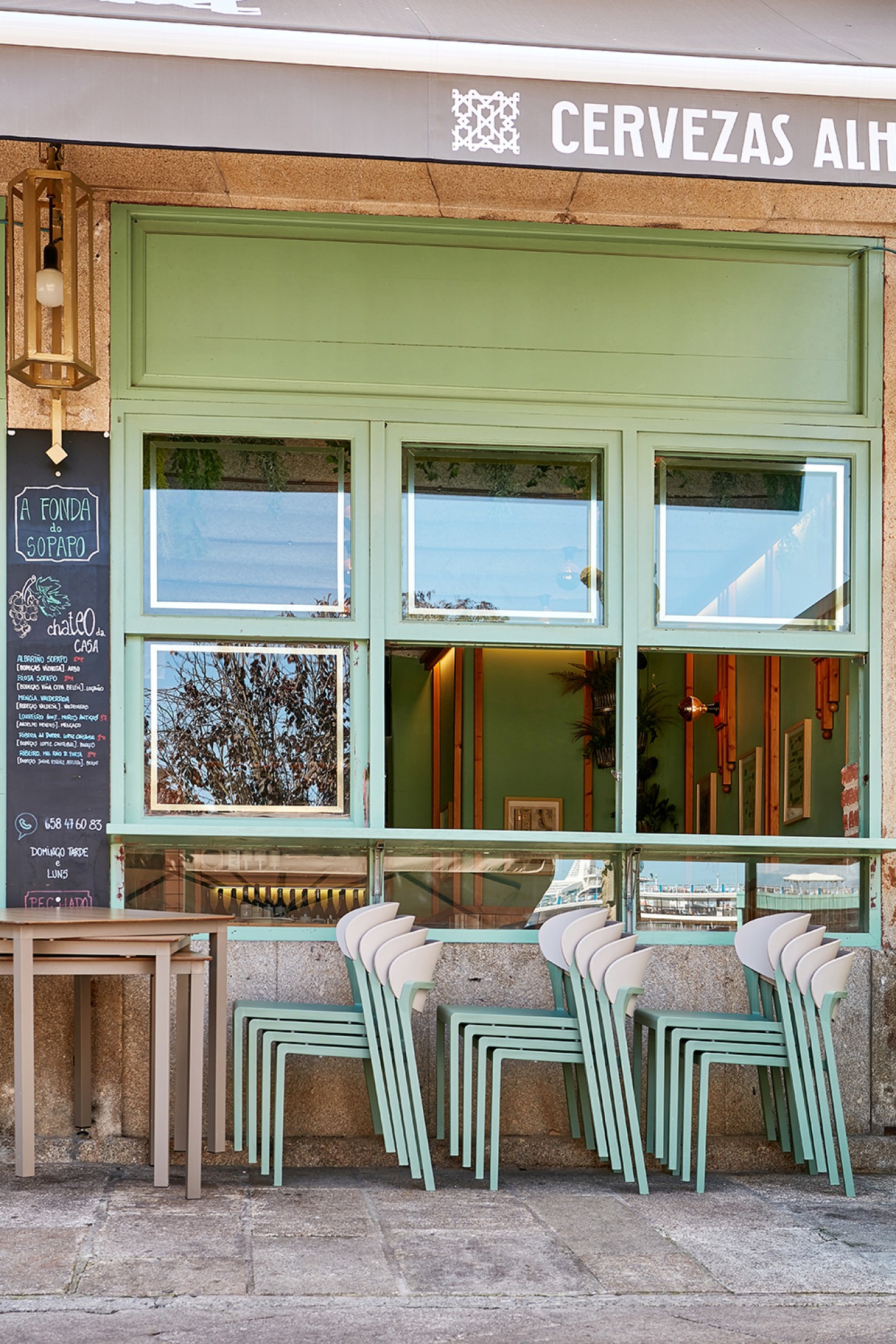 Silla apilable con diseño envolvente y estructura de polipropileno con fibra de vidrio. Disponible en colores inspirados en la naturaleza. Apta para interior y exterior.