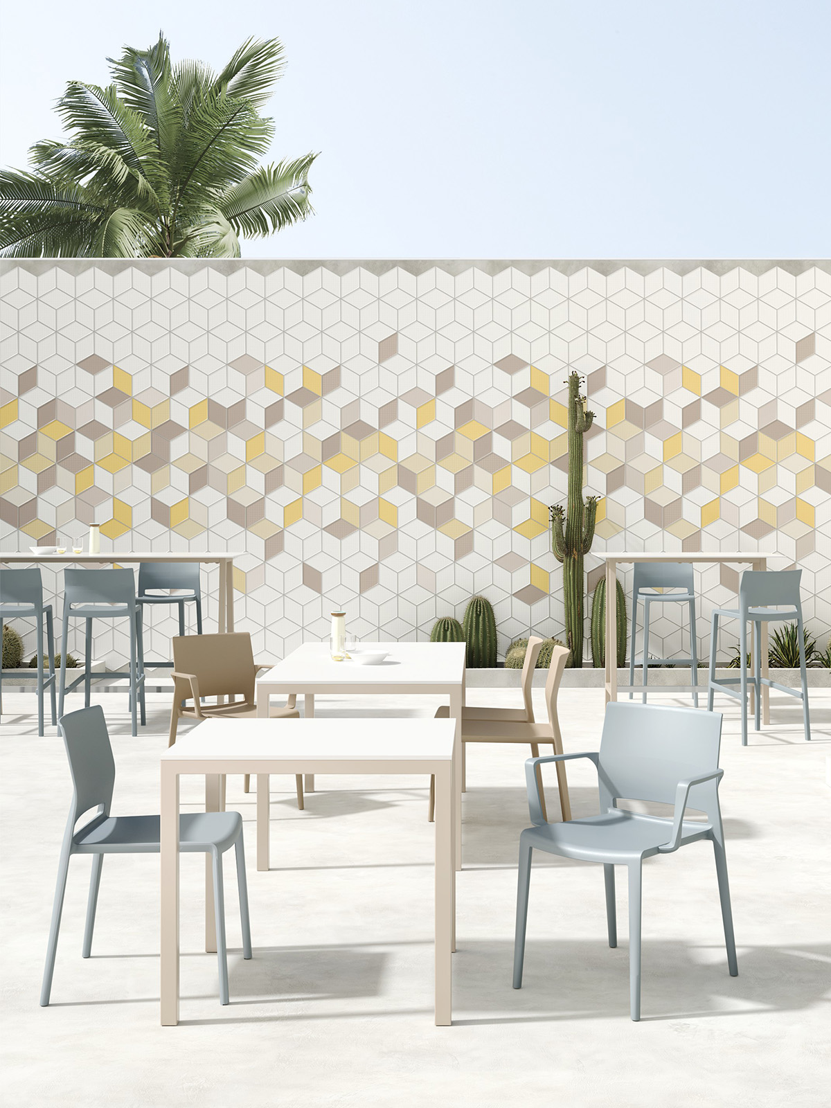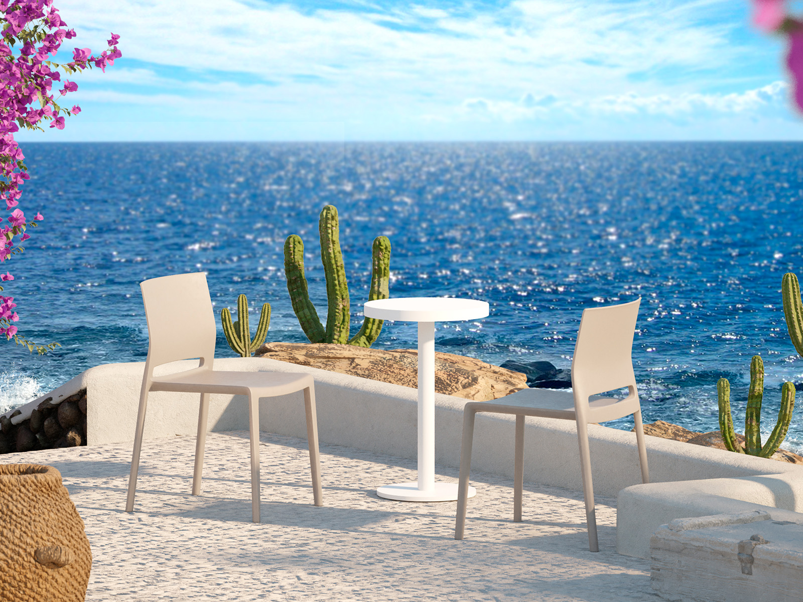 El banco Bakhita es ligero, apilable y extremadamente resistente. Su diseño moderno y materiales de alta calidad lo hacen ideal para interiores y exteriores.