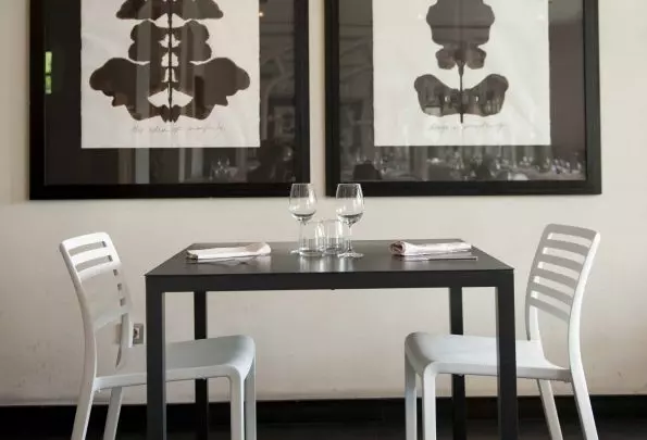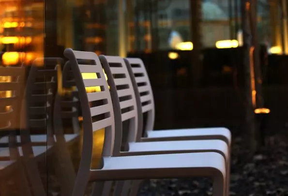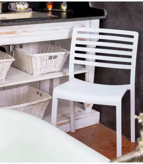 Silla apilable para interior y exterior, fabricada en PP y fibra de vidrio con moldeo asistido por gas. Ligera, resistente y con protección UV. Peso: 4 kg. Accesorio opcional: pinza de unión para eventos.