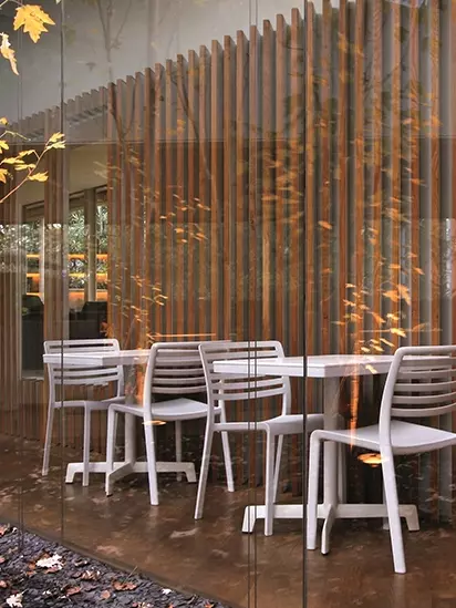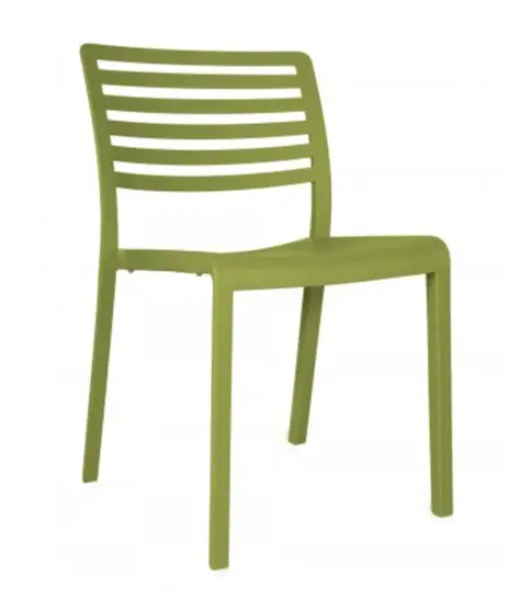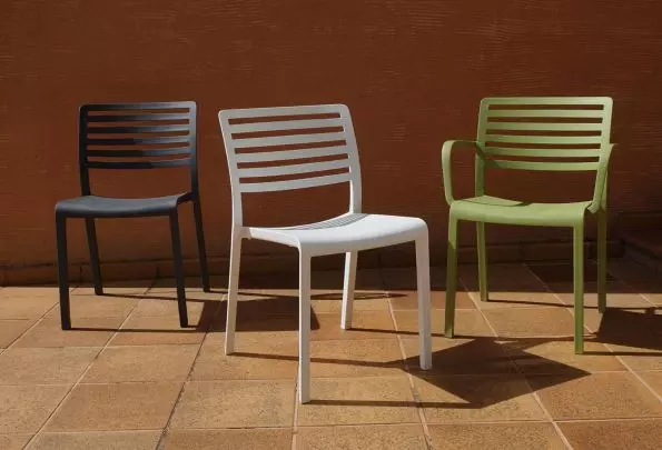 Silla versátil para uso interior y exterior, inyectada en polipropileno (PP) reforzado con fibra de vidrio mediante tecnología de moldeo asistida por gas, lo que garantiza una estructura robusta, ligera y sin tensiones internas.
