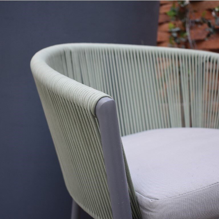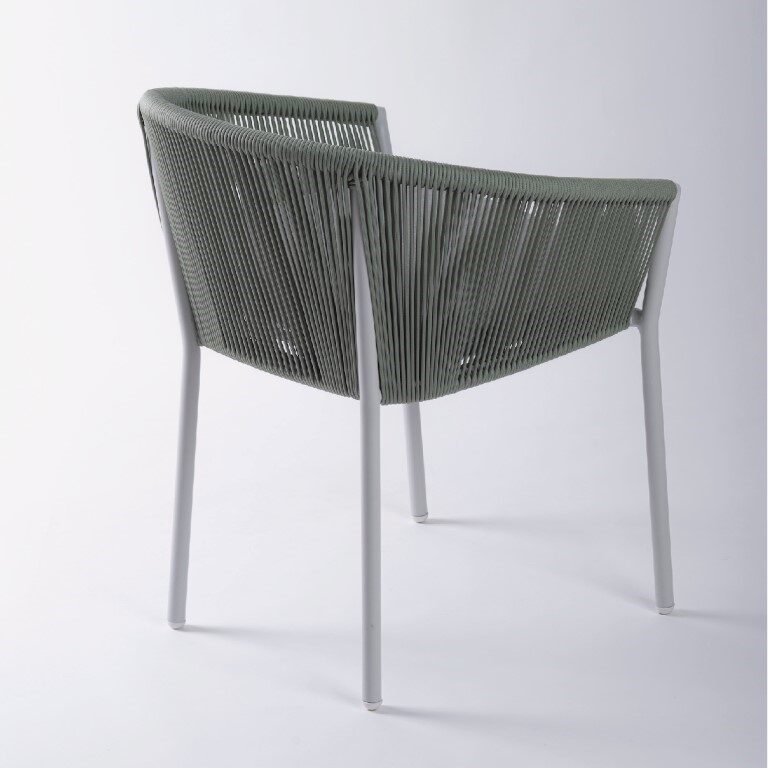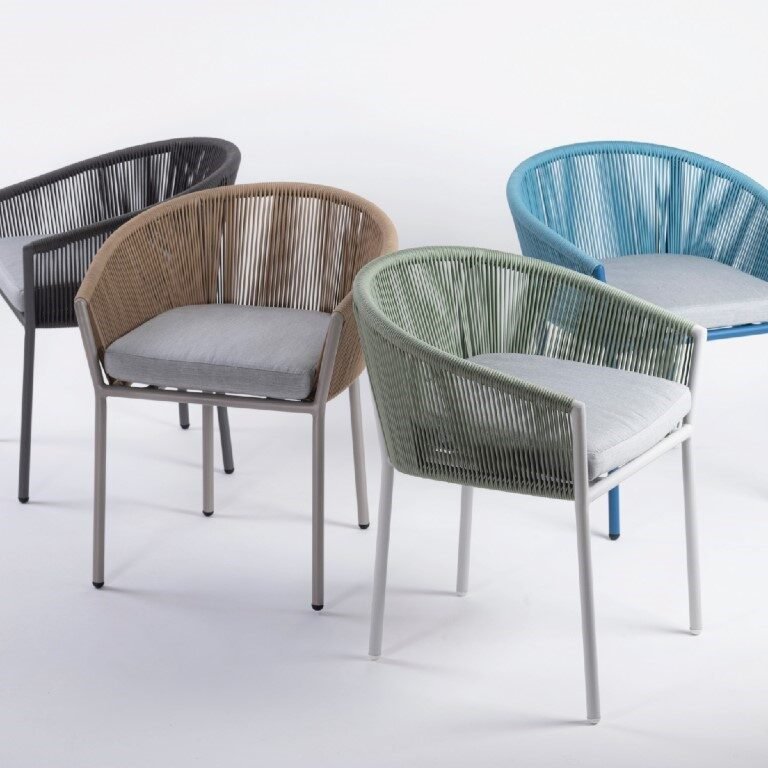 Silla Kulte con estructura de aluminio, cordón de polipropileno y tela acrílica. Diseño elegante y resistente para exteriores.