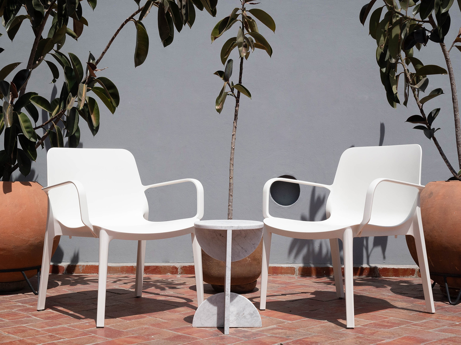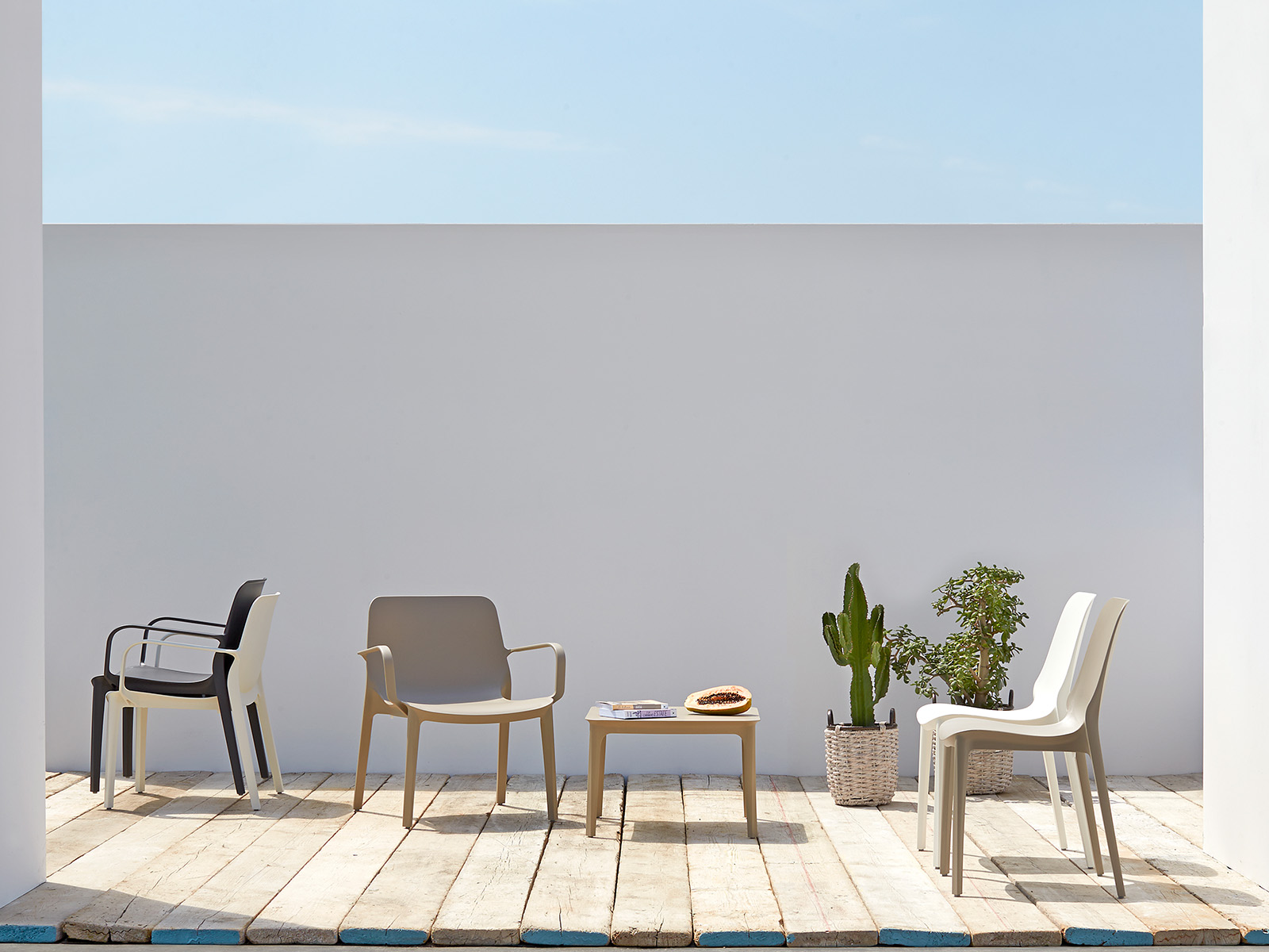 Silla tipo lounge apilable, fabricada en tecnopolímero reforzado con fibra de vidrio. Ligera, resistente y perfecta para interiores y exteriores.
