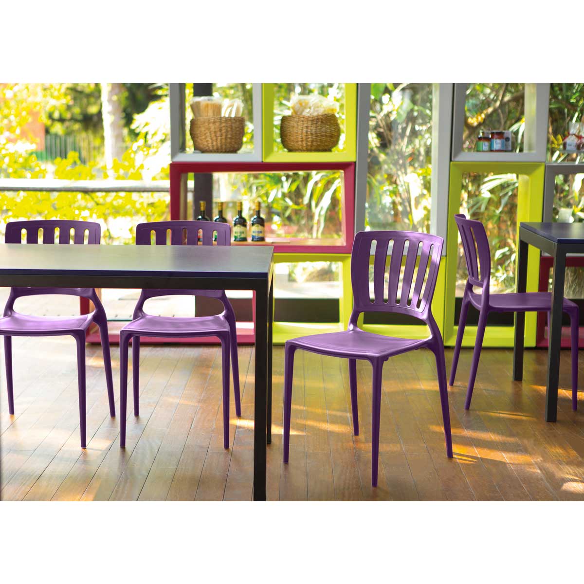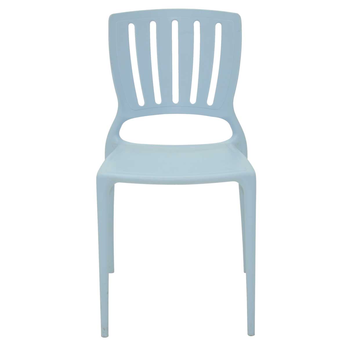 Sin brazos y con respaldo calado vertical la silla Sofia está fabricado en polipropileno y fibra de vidrio lo que la hace muy resistente soportando cargas de hasta 182 kilos.