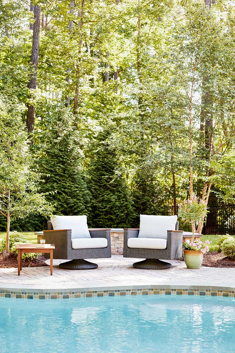 Sillón giratorio Coral para exteriores es una fina colección de muebles que realzará una habitación en interior o exterior. Tejido a mano con material de fibra Viro® sobre un marco de aluminio con patas de madera de Ipe.