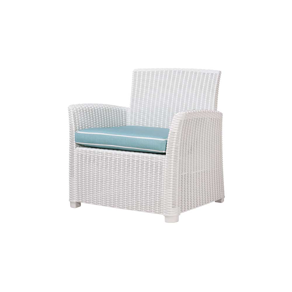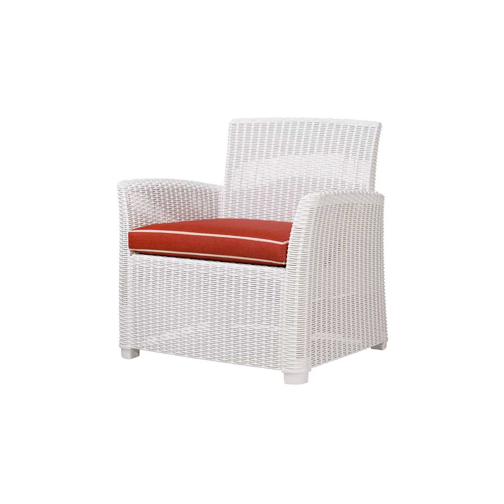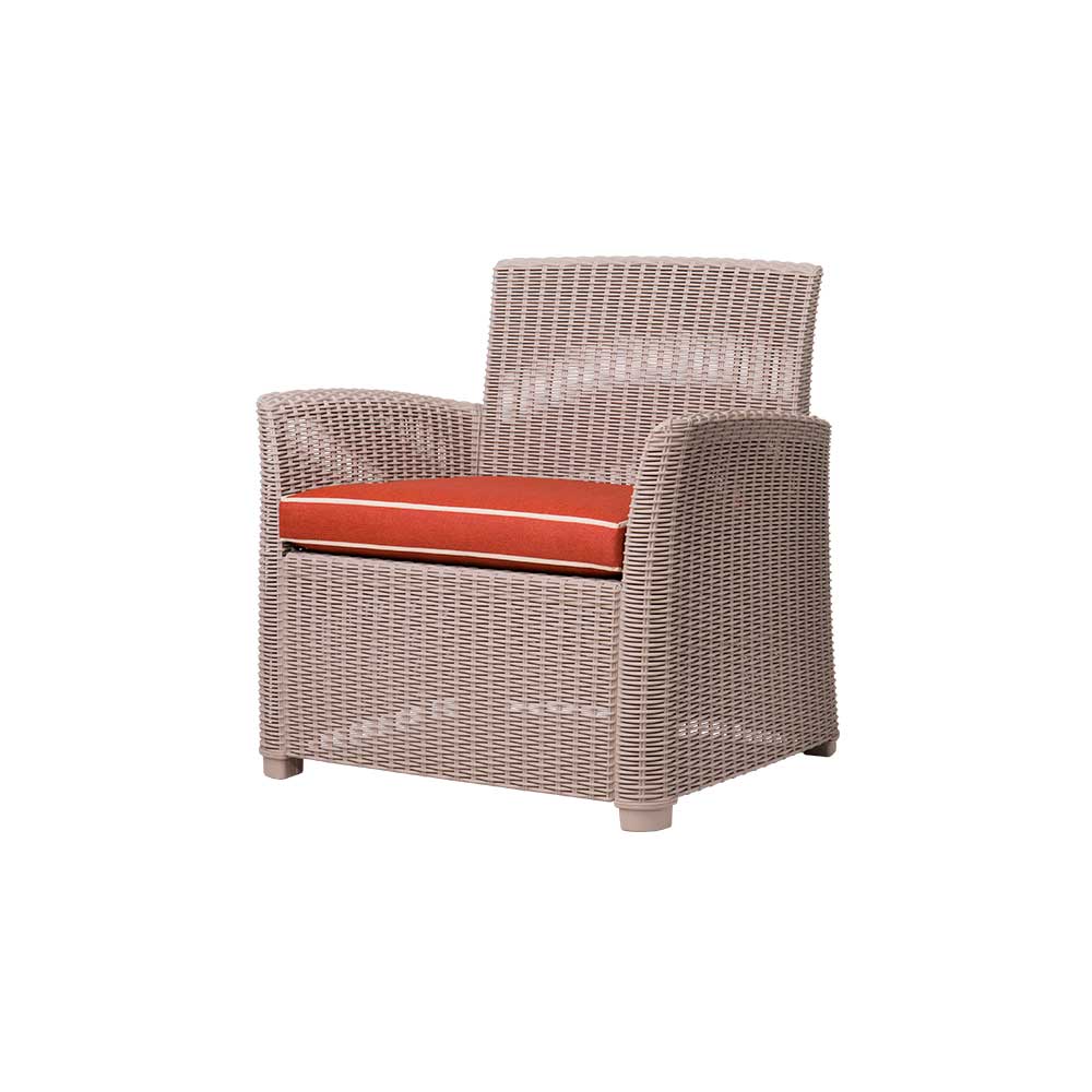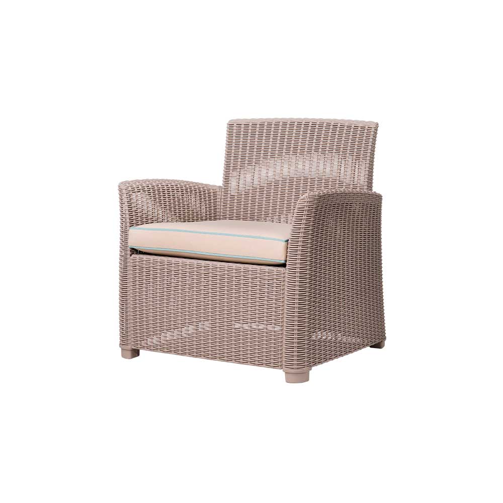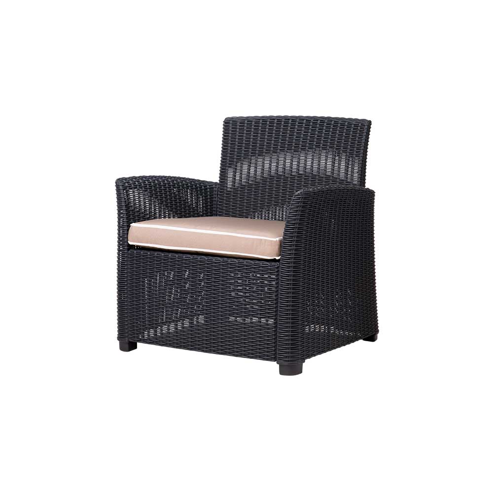 Fabricado en polipropileno reciclable, ofrece alta resistencia, durabilidad y fácil mantenimiento, además de un atractivo acabado tipo mimbre que aporta calidez sin requerir cuidados complicados. Su forma envolvente y respaldo cómodo invitan al descanso, mientras que su estética natural lo convierte en una pieza que armoniza con cualquier ambiente exterior.