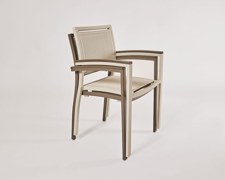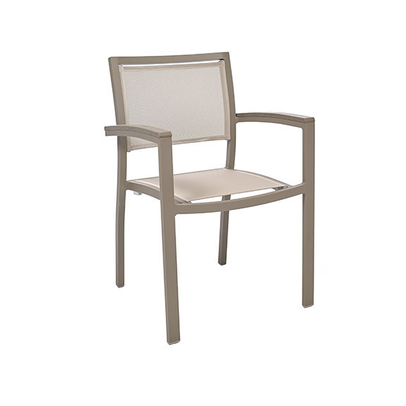 Sillón MÓNACO para exteriores, apilable y resistente. Estructura de aluminio con asiento y respaldo en tela Phifertex®. Ideal para terrazas, jardines y restaurantes.