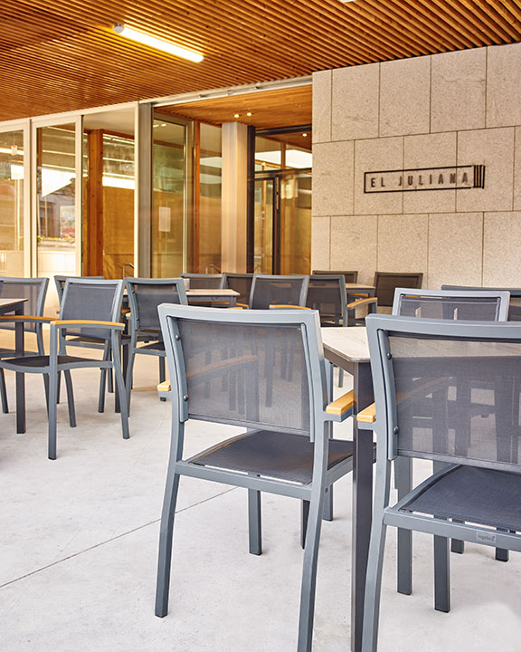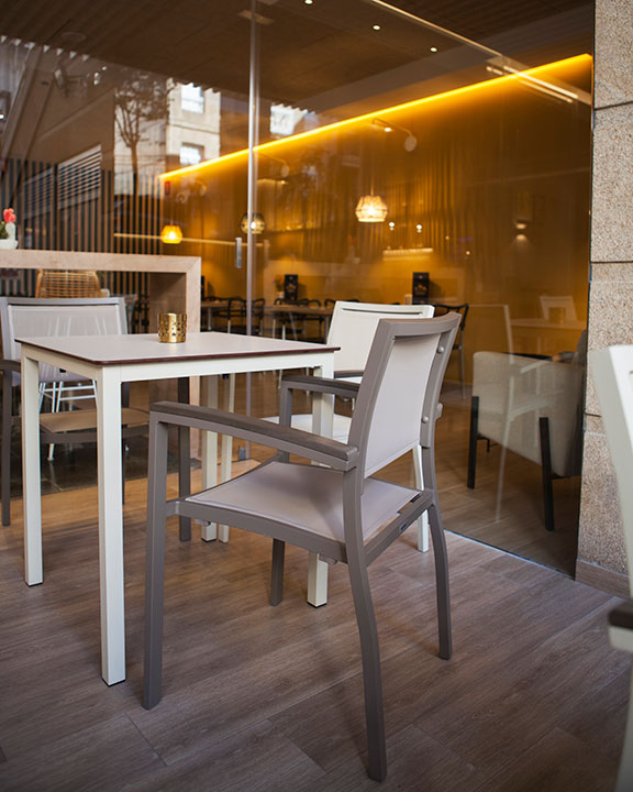 El Sillón MÓNACO es una excelente opción para espacios al aire libre como terrazas, jardines, bares y restaurantes. Su estructura de aluminio proporciona ligereza y resistencia, mientras que el asiento y respaldo están fabricados en tela microperforada Phifertex®, ideal para exterior.