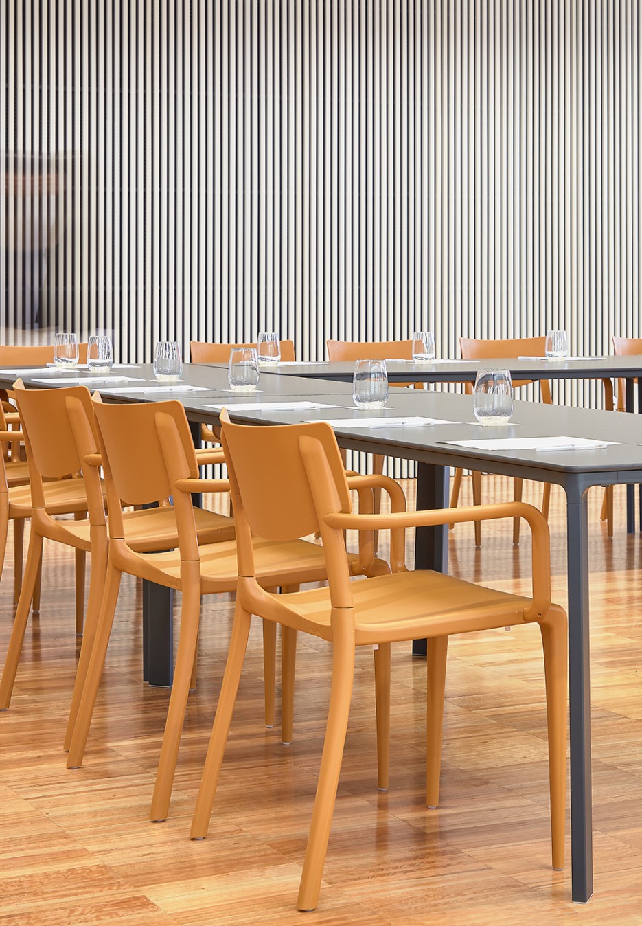Silla apilable de inspiración retro, ideal para interiores y exteriores. Disponible en combinaciones de color vibrantes. Fabricada en polipropileno con fibra de vidrio, 100 % reciclable, con protección UV y tacos antideslizantes. Muy fácil de limpiar y desinfectar.