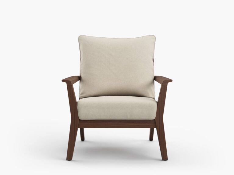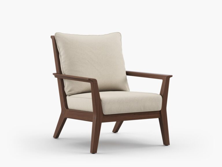 Diseñado para el descanso prolongado, cuenta con un respaldo inclinado y un asiento amplio, que brindan una experiencia ergonómica y relajante. Sus reposabrazos lineales se integran de manera fluida con la estructura, extendiéndose hacia las patas robustas, todas elaboradas con listones esculturales de madera maciza de Ipe, aportando una estética sólida y refinada.