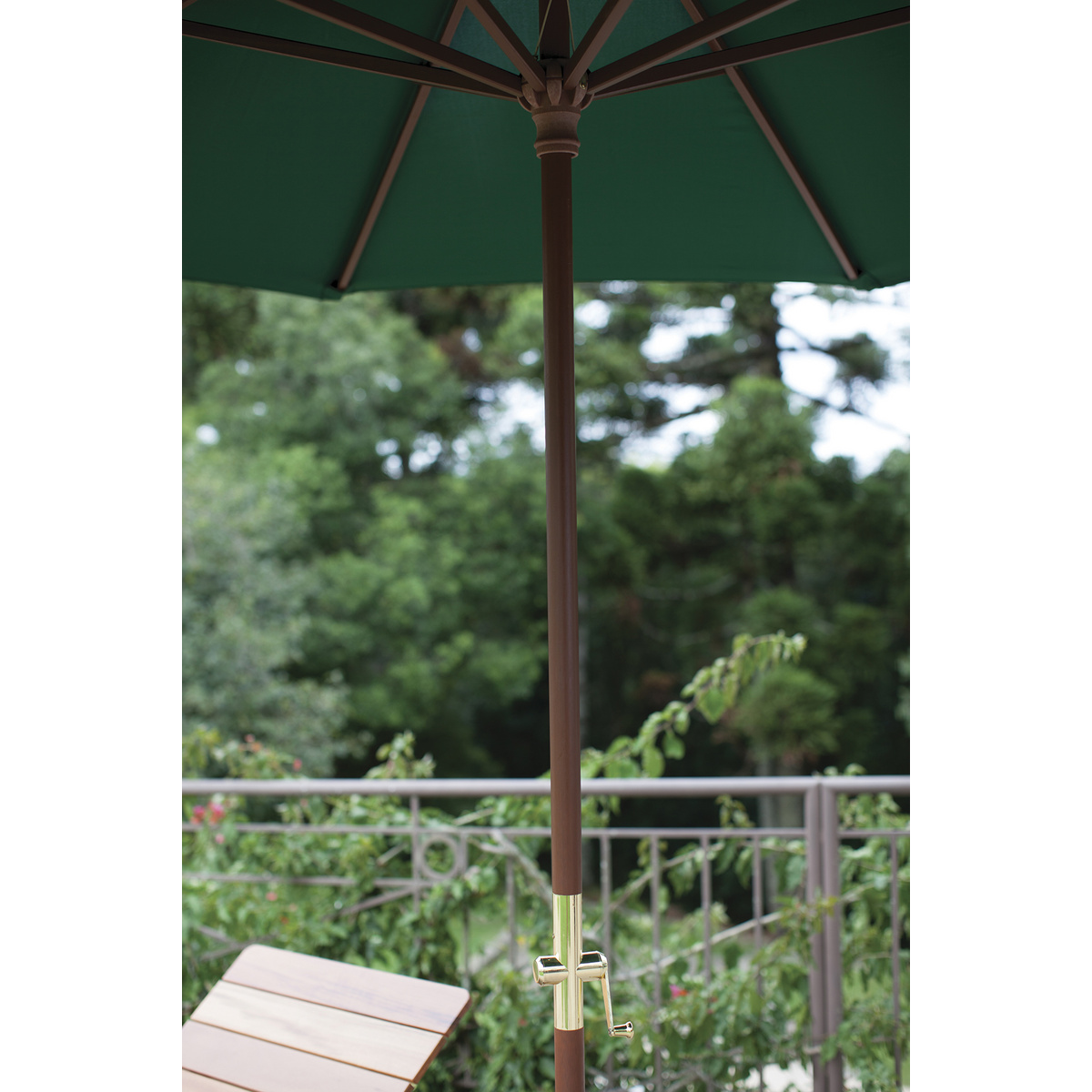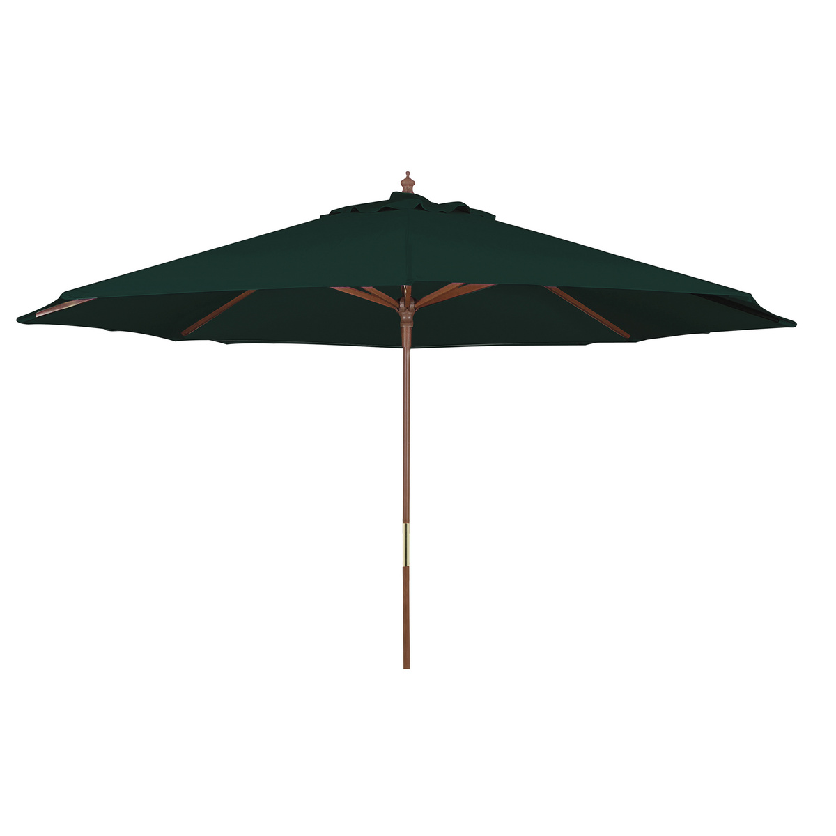 Sombrilla verde de 3 metros de diámetro, fabricada en madera y poliéster. Amplia, resistente y perfecta para terrazas, jardines y grandes espacios al aire libre.