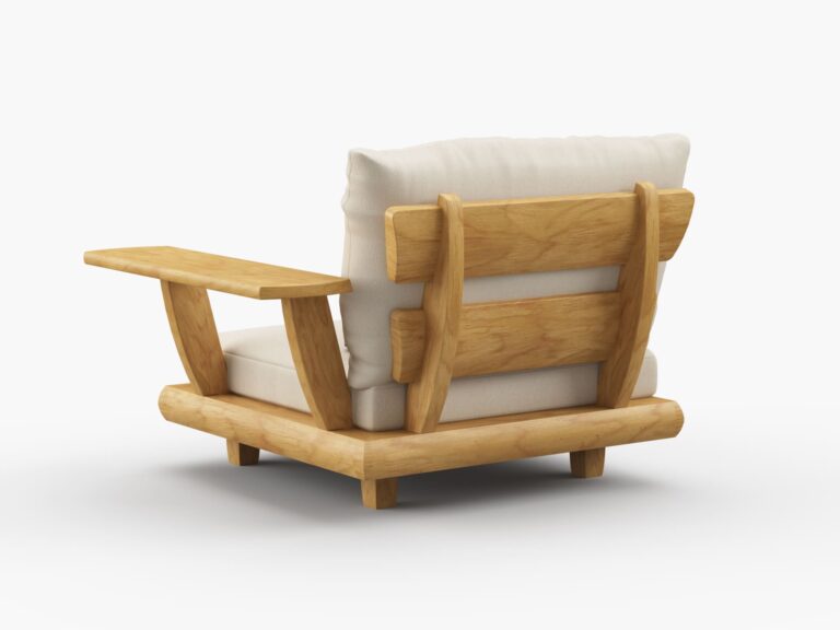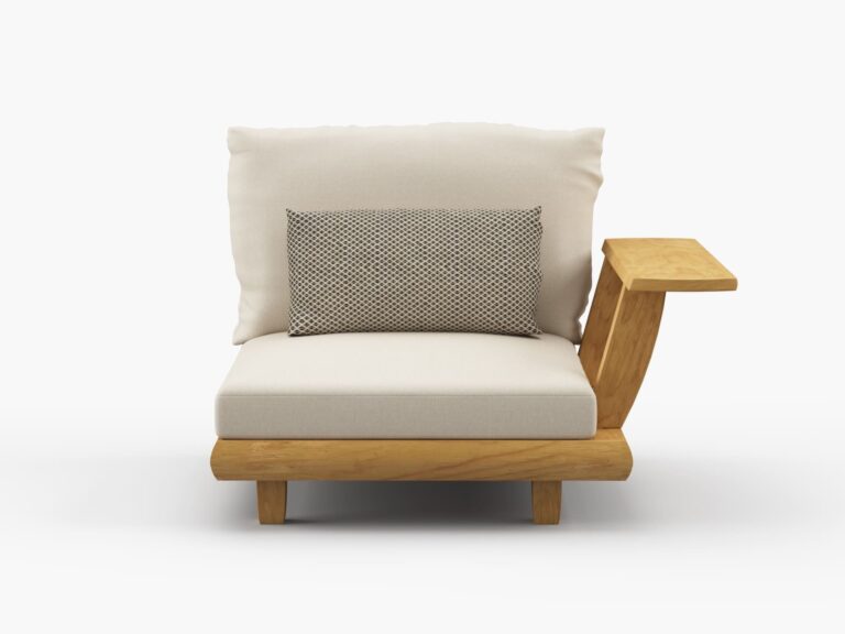 El confort se logra a través de un respaldo y reposabrazos esculpidos, que brindan soporte ergonómico, junto con un asiento amplio que invita al descanso prolongado. La estructura se apoya sobre patas cónicas elaboradas con listones lineales de madera maciza de teca, aportando estabilidad y una presencia visual elegante.