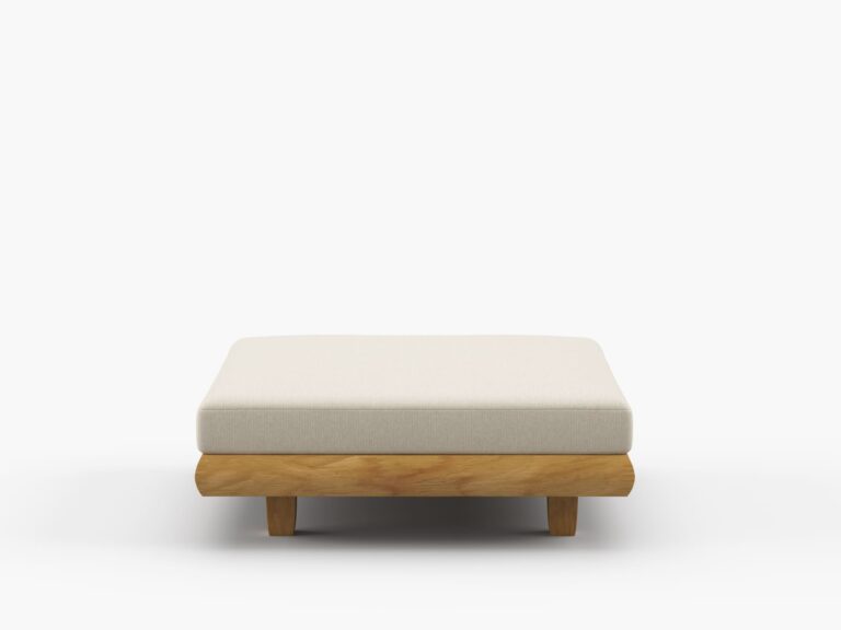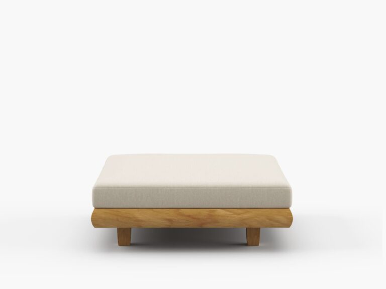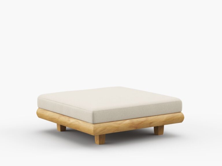 Diseñado para adaptarse a distintas necesidades, puede utilizarse como asiento adicional o reposapiés, convirtiéndose en un elemento práctico y elegante dentro de cualquier configuración lounge. Su estructura amplia y proporciones equilibradas ofrecen comodidad, mientras que sus patas esculpidas en listones individuales de madera maciza de teca aportan solidez y una estética refinada.
