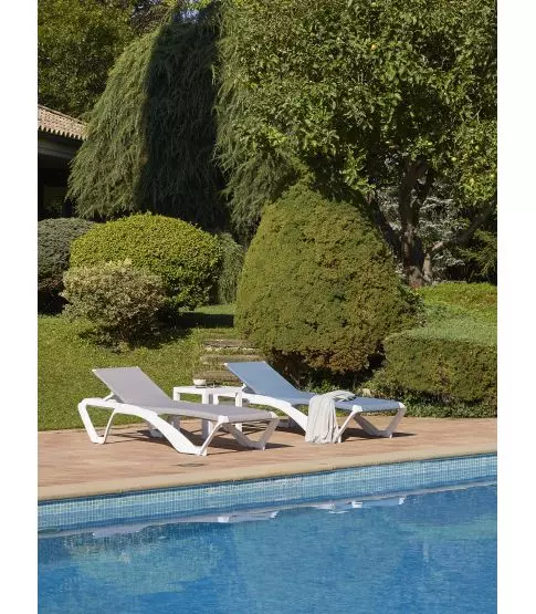 Tumbona apilable con estructura de polipropileno y fibra de vidrio. Textilene termosoldado de alta resistencia, respaldo reclinable en 4 posiciones, ruedas traseras, tacos antideslizantes y posavasos integrado. Peso: 10,65 kg.