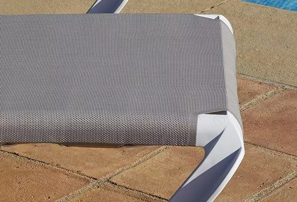 El asiento incorpora textilene termosoldado de 850 g/m², con trama y urdimbre de doble hilo, que proporciona gran resistencia al uso intensivo y a la intemperie. Cuenta con protección UV, evitando la decoloración y el deterioro por exposición solar.