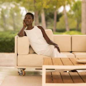 Color: Crema / Teka Natural / Tela Ecru 1047. La butaca Vineyard es una extensión compacta y refinada del sofá de la misma colección. Su estructura en madera de teca natural, combinada con una base de polietileno en color crema y cojines en tela Ecru 1047, la hacen ideal para exteriores de lujo. El diseño cálido y equilibrado de Ramón Esteve se adapta fácilmente a ambientes contemporáneos o rústicos. La ergonomía de su forma y la suavidad de su tapizado aseguran comodidad prolongada, mientras que su construcción robusta garantiza durabilidad. Es perfecta como pieza única o como parte de un conjunto, elevando cualquier terraza, jardín o espacio interior con su presencia elegante y natural.